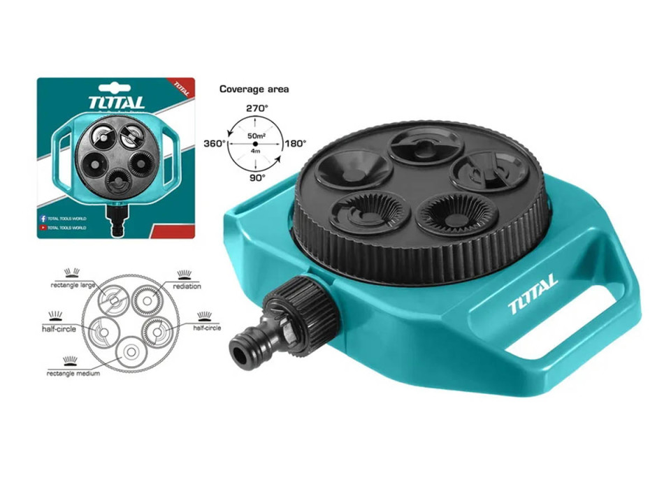THPS63022, Пластиковый дождеватель-ороситель 5в1 (коннектор 3/4') TOTAL за 528.32 руб. купить со склада в Москве. Описание, характеристики, аналоги, условия доставки, цены и наличие товара в каталоге на официальном сайте интернет-магазина www.triatron.ru Доставка по Москве и России.