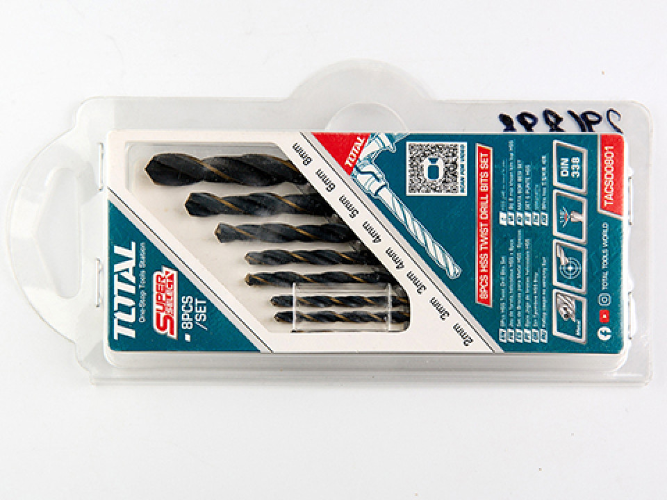 - Набор сверл по металлу HSS 8шт 2X49,3X61,3X61,4X75,4X75,5X86,6X93,8X117, для дрели Total
