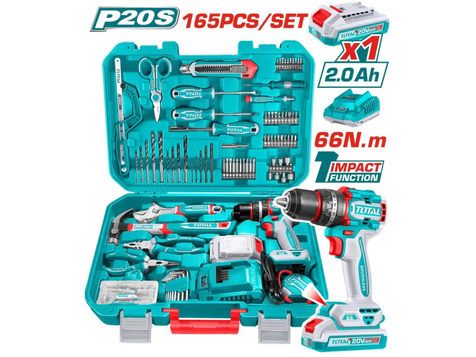 THKTHP11652, Набор инструментов с аккумуляторной дрелью 165шт, 20В литий-ионная ударная дрель TOTAL