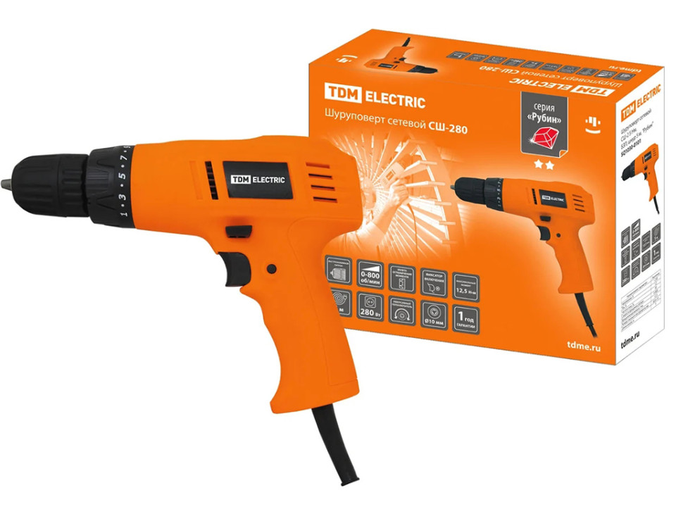 - SQ1030-0101, Шуруповерт сетевой СШ-280, 280 Вт, 12.5 Нм, БЗП, шнур 5 м, ''Рубин'', TDM Electric