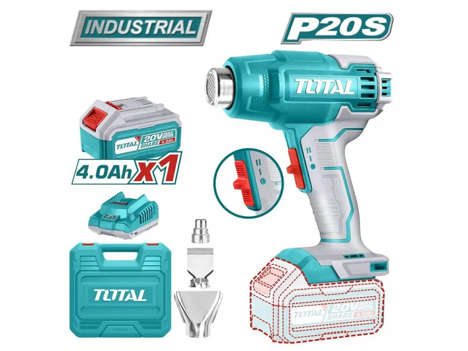TBLI20025, Аккумуляторный технический фен Li-Ion 20V, 300/550°С, 100/200л/мин с аксессуарами и ЗУ и