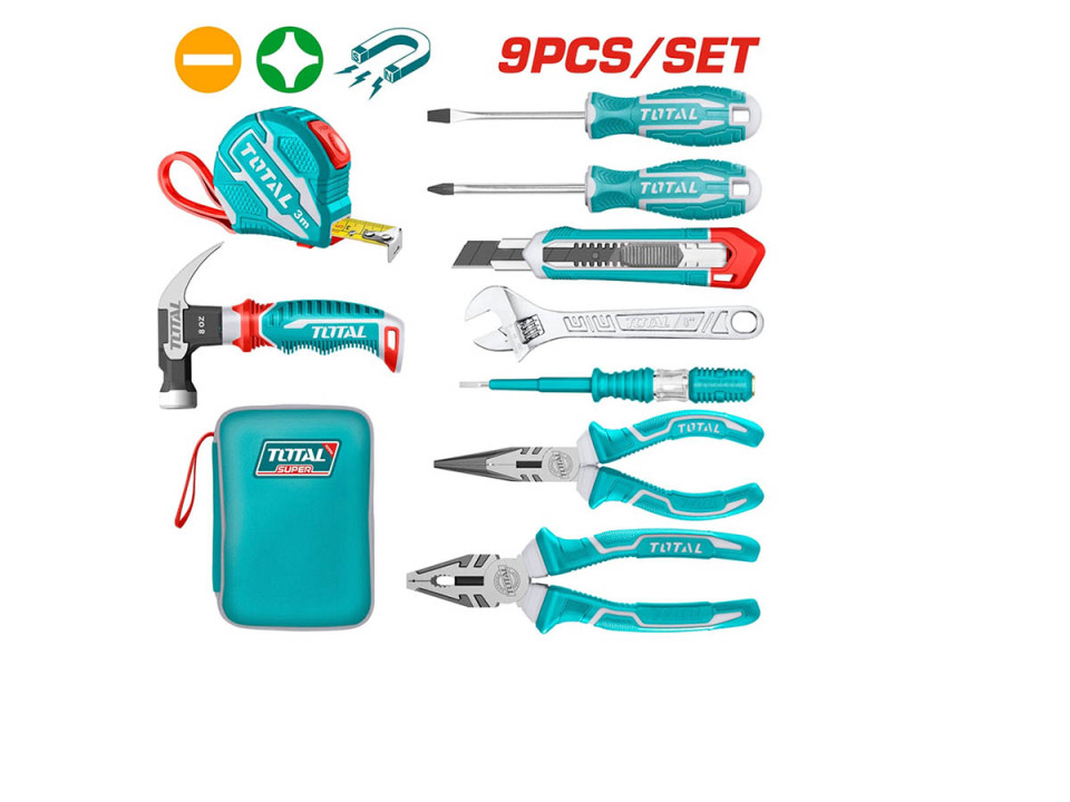 - THKTHP90097, Набор инструментв 9шт (измерительная лента, отвертки, плоскогубцы, нож, мини молоток с