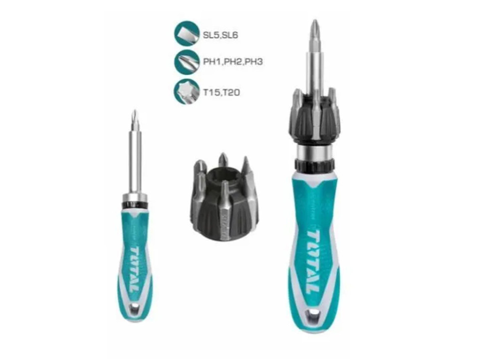 TACSD30086, Отвёртка трещёточная с битами 8 шт ТОТАL Биты : SL5, SL6, PH1, PH2, PH3 Т15, Т20., TOTA