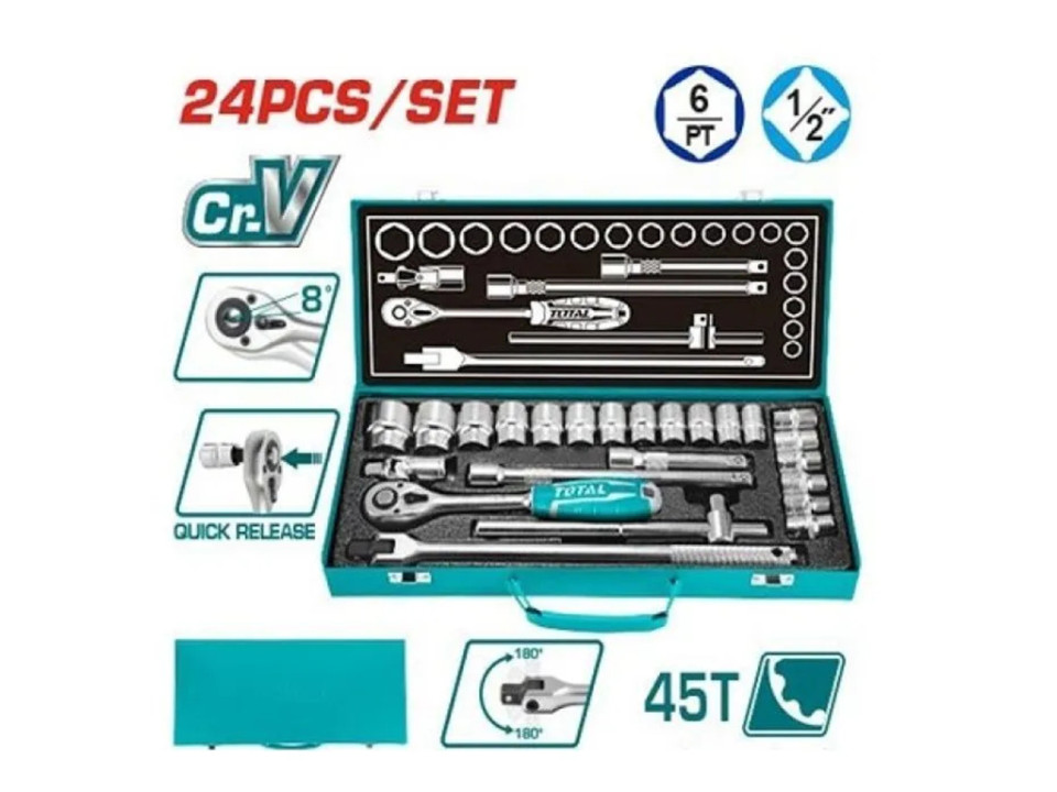 THT121242, Набор головок 1/2' с трещоткой 24шт, материал Cr-V(50BV30) TOTAL