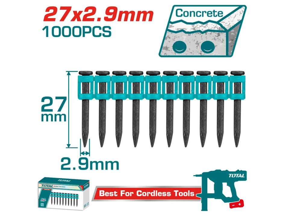 TAC02271, Гвозди для гвоздезабивателя,применения бетон, 27мм,1000шт.,диаметр: 2,9мм Total, TOTAL
